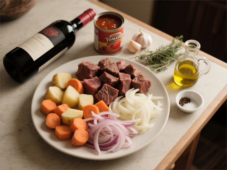Prep Time: 20-30 minutes Cook Time: 2-3 hours Serves: 3-5 people Ingredients: 500g beef brisket 1 onion 1 carrot 1 potato 200ml red wine 1 can (or bottle) of crushed tomatoes 3 cloves garlic Thyme (to taste) 20g light soy sauce 3…