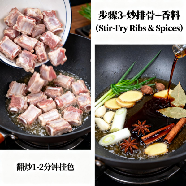 Step 3: Stir – Fry Ribs + Stir – Fry Spices (Enhance Aroma and Flavor)