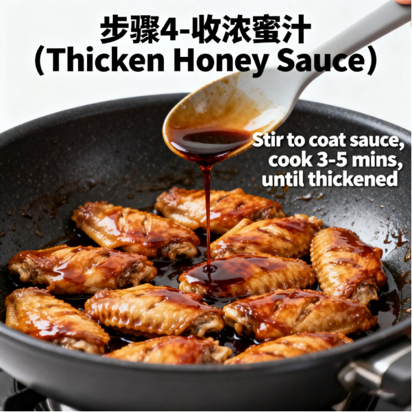 - Push the chicken wings from the side of the pan back into the honey glaze. Stir-fry continuously for 1-2 minutes with a spatula to ensure each chicken wing is evenly coated with the honey glaze (maintain medium-low heat throughout and keep stirring to prevent the honey glaze from sticking to the bottom of the pan and burning—honey is high in sugar and burns easily over high heat).