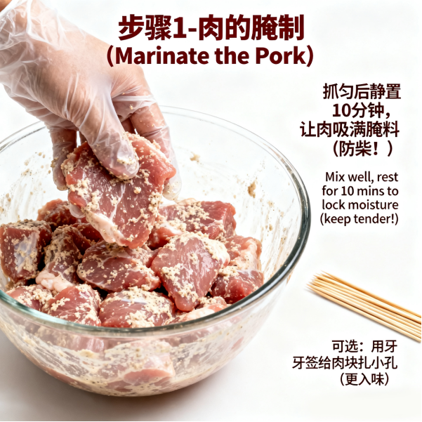 - Prepare the pork: Cut the tenderloin into 2 – centimeter cubes (Do not cut them too large, as they may not cook through; do not cut them too small either, as they may burn easily). Place the cubes in a bowl, add cooking wine, salt, and white pepper (if using). Mix well with your hands and let it sit for 5 minutes. Then add 1 tablespoon of corn starch, continue mixing until each piece of meat is coated with starch. Finally, add the egg liquid and mix well for later use (The egg liquid helps the subsequent coating adhere more firmly).
