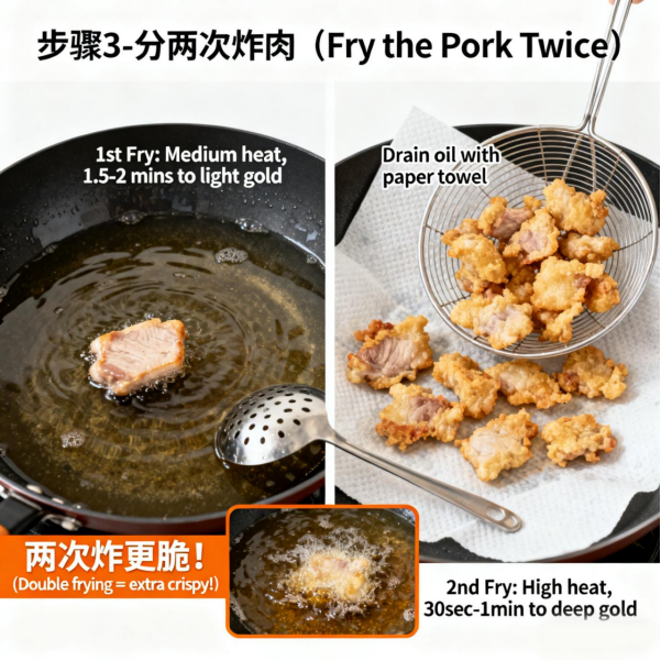 Step 3: Fry the Meat (Fry Twice for Tender Inside and Crispy Outside!)