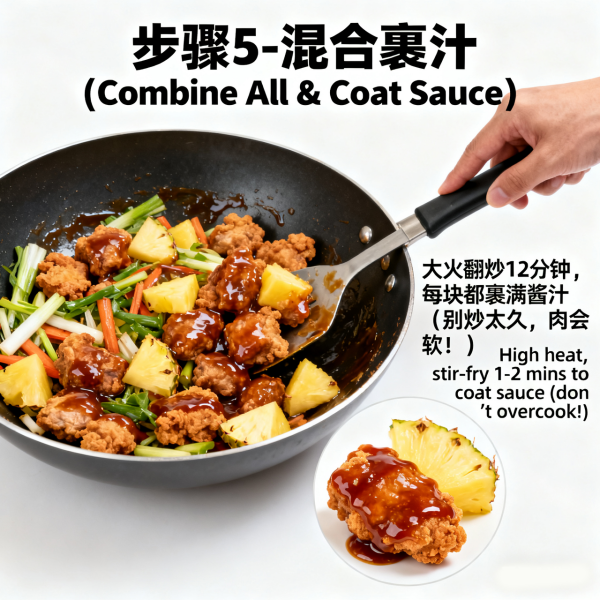 - Put the fried meat pieces, stir – fried pineapple, green bell pepper, and onion into the thickened sauce. Turn to high heat and stir – fry quickly for 1 – 2 minutes to ensure each piece of meat and each side ingredient is evenly coated with the sauce (Do not stir – fry for too long, otherwise the meat will become soft and lose its crispiness).