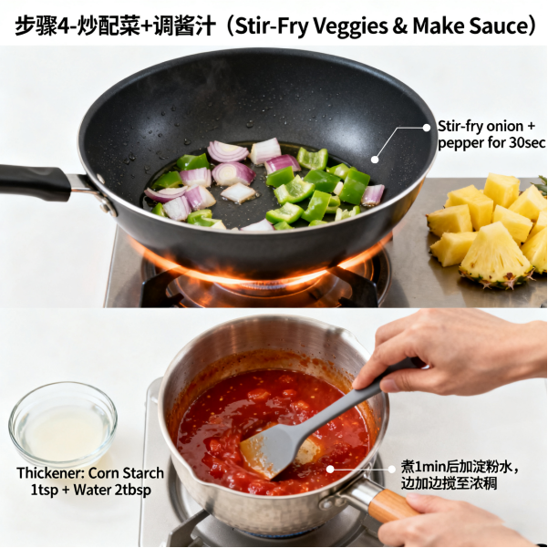 Step 4: Stir – Fry the Side Ingredients + Prepare the Sauce (Key to the Sweet – and – Sour Flavor!)